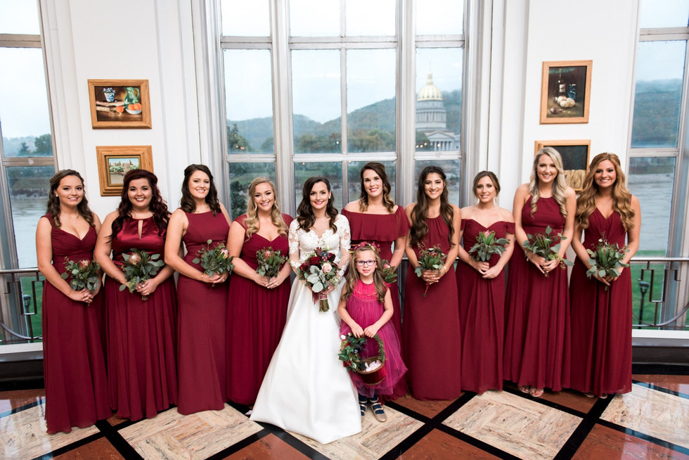 Anna and Trevor have known each other since middle school and have some pretty amazing throwback pics at Trevor's senior prom. Besides the incredible fall bouquet and Anna's beautiful dress, my favorite part about this wedding day was the cheerful attitude of the couple despite numerous things not going as planned. We originally had an hour set apart to take photos in downtown Charleston with their wedding party, but it ended up pouring freezing rain the ENTIRE day- not letting up for a second. We compromised and took some shots outside the hotel under a dry overhang. The outdoor ceremony was moved indoors, things ran behind, and the trolley that was transporting the bride and groom and huge wedding party broke down on the way from the ceremony to the reception! Any one of those things could lead a bride to be overwhelmed with the stress, but Anna and Trevor were just so happy to finally be married and were down to make things work as long as they could be together. I think this is a great example of why it's nice to plan a first look with your partner ahead of time- you never know what mishaps are going to push your schedule behind! I also think we got some beautiful portraits of the couple despite the weather (I mean... this couple is completely gorgeous in any setting). Rain on your wedding day is 100% good luck. (And if you're planning a wedding in West Virginia, there's a good chance you'll get some of that luck.) Vendor Info: Ceremony Venue: Erma Byrd Art Gallery in University of Charleston Reception Venue: Woman's Club of Charleston Cake/Cupcakes: Lil Bit of Heaven Cupcakes Vinyl DJ: Vinyl Village Catering: Lola's Pizza Florist: Flowers on Olde Main Make-Up: Markayla Maynard Hair Stylists: Jeni Edwards and Sierra Harper Dress: The Boutique by B. Belle Events Bride's Shoes: Worthington Beckwith Groom Suit: Estep's Bridesmaid Dresses: The Dessy Group